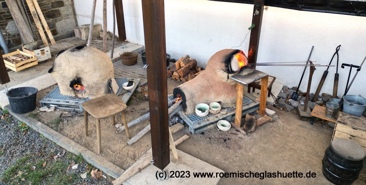 Die zwei holzbefeuerten Lehmöfen der Römischen Glashütte in der RömerWelt am caput limitis sind nach römischem Vorbild rekonstruiert. Als Inspiration diente insbesondere die Abbildung auf drei römischen Öllampen aus dem 1. Jahrhundert nach Christus (siehe www.glasrepliken.de/p_artikel_oellampe.htm). Einer der beiden Öfen wird auf 1.000 bis 1.100 °C geheizt und enthält eine Schmelzschale, in der bis zu 2 kg Glas erhitzt werden können. Sobald das Glas flüssig und blasenfrei genug ist können an diesem Ofen in antiker Tradition Glasgefäße geblasen werden. Der zweite Ofen sammelt die Tagesproduktion und lässt die Glasgefäße bei etwa 450 °C verharren. Über Nacht kühlt dieser (Ab-)Kühlofen dann langsam aus. Das stundenlange Abkühlen dient dem Abbau von Spannungen im Glas. Erst danach sind die Glasgefäße verwendbar. Diese Art der Gefäßglasherstellung ist eine römische Innovation und hat sich im Wesentlichen seit 2.000 Jahren nicht verändert.