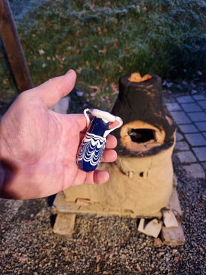 Anlässlich des Kurses "Kerngeformte Glasgefäße in der archäometrischen Forschung und im Experiment" der Ruhr-Universität Bochum wurde im Winter 2024 ein mobiler "XXL-Perlenofen" erbaut. Bei deiser Glasverarbeitungstechnik wird Glas nicht geblasen, sondern auf einem Lehmkern aufgebracht, aufgeschmolzen oder aufgewickelt. Im Unterschied zu den kleineren Perlenöfen verfügt dieser Ofen deswegen über zwei seitliche Arbeitsöffnungen, die es ermöglichen, Glas aus bis zu zwei Schmelzgefäßen zu entnehmen. Auch dieser Ofen erreicht seine Arbeitstemperatur von bis zu 1.100 °C nur mit Holzfeuerung.